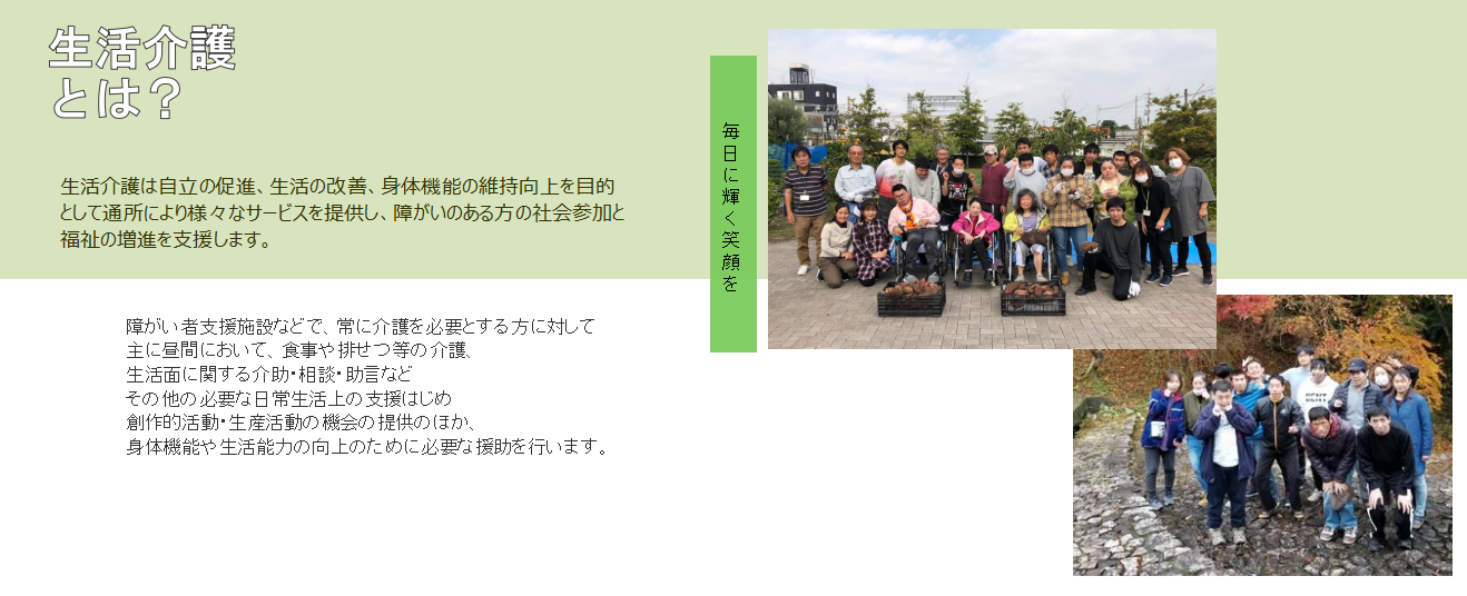 障がい者支援施設などで、常に介護を必要とする方に対して主に昼間において、食事や排せつ等の介護、生活面に関する介助・相談・助言などその他の必要な日常生活上の支援はじめ創作的活動・生産活動の機会の提供のほか、身体機能や生活能力の向上のために必要な援助を行います。